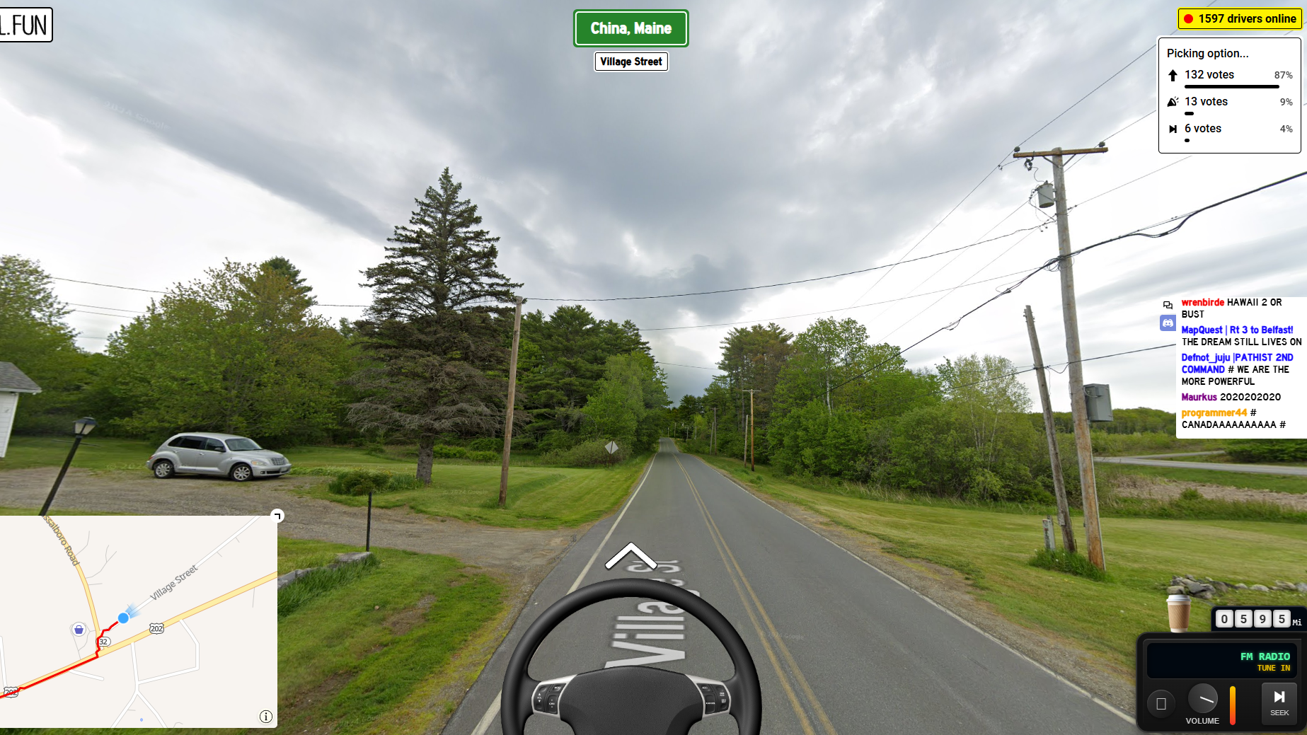 1610 so-called “drivers” are currently online, traversing the highways of New England via images from Google Streetview that update every 10 seconds. Just as with internet phenomenon Twitch Plays Pokémon, viewers can collectively vote to determine which direction the car heads next.