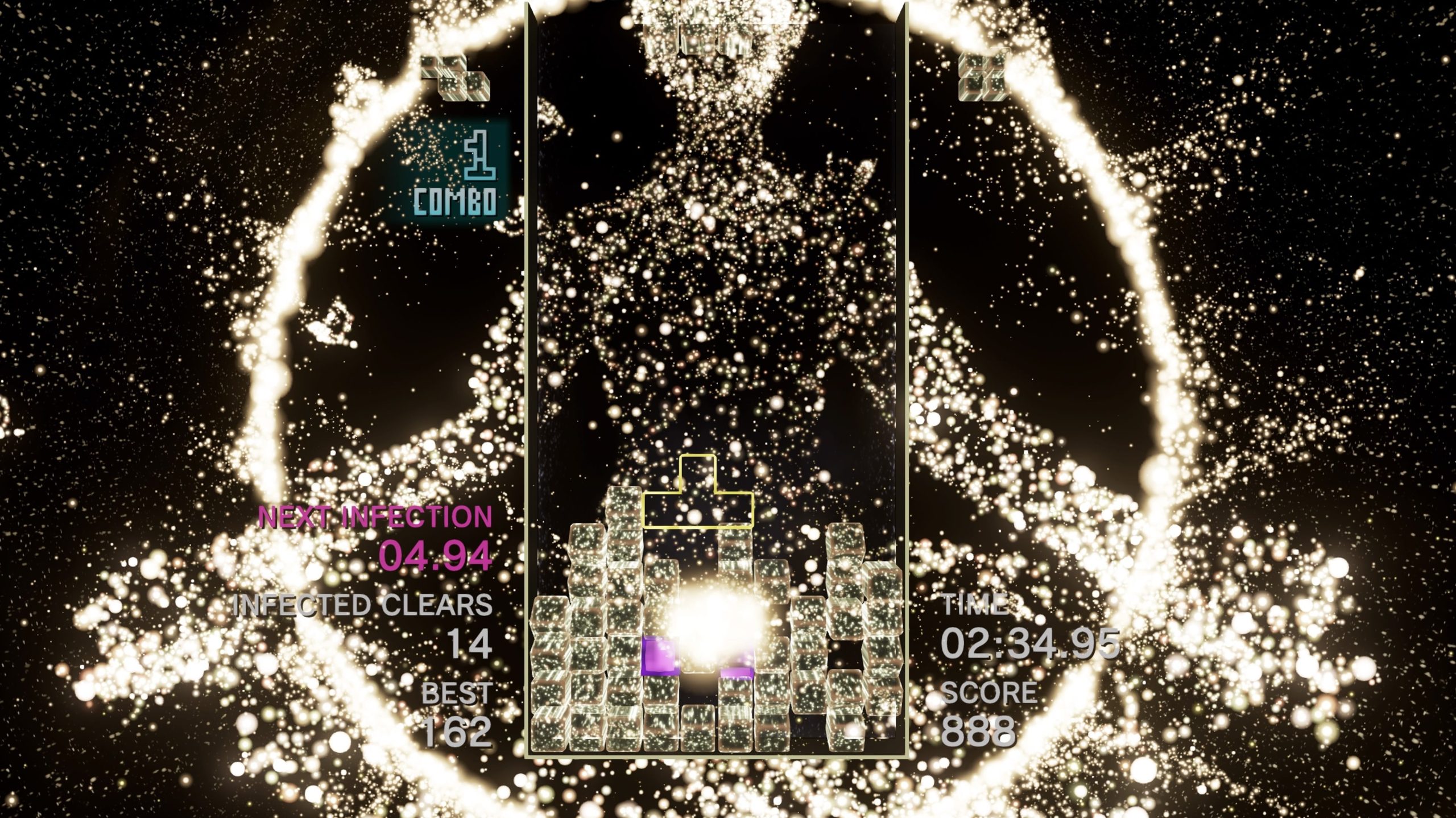 For a game that you might suspect would be equally at home with gods or robots behind the controller, what’s so life-affirming about the audiovisual elements of Tetris Effect is how much they highlight the embattled human element. Every action in Tetris Effect has a sound-effect reaction. Every twist of a Tetrimino block, every change of lane, every hard- or soft-drop and every clear. What this means is that I can suddenly hear all the strange things I do when I play. Tetris Effect gives voice to my indecision, my uncertainty. In the end-game, it arpeggiates my horrific abuse of infinite spin. Mizuguchi has made a career of exploring synaesthesia, the merging of senses that aren’t traditionally directly connected in the central nervous system. For people with synaesthesia, days of the week might each hang at their own height above the bed on waking, or numbers might have their own colours. Games like Rez, like Lumines, give non-synaesthesiacs (that word is a punt, and it comes, again, with my apologies) a sense of the contours of this high-altitude state of being.